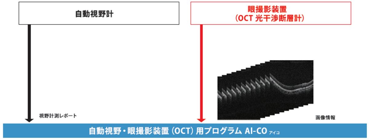 「AI-CO」は、近赤外線を使って網膜の断面を画像化するOCT(光干渉断層計)から出力された画像情報(3Dスキャンデータ)を読み込み、濃淡の付いた平面グレースケール画像として表示します。また、自動視野計から出力された視野計測結果を表示し、医師の目で見比べることが可能です。